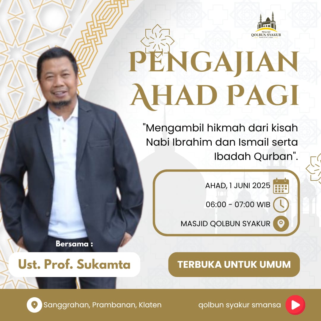 Insya Allah akan diselenggarakan pengajian Ahad pagi di Masjid Qolbun Syakur pada :